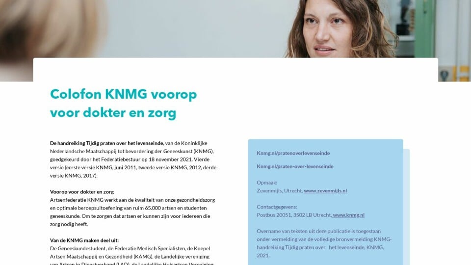 Overname van teksten uit deze publicatie is toegestaan onder vermelding van de volledige bronvermelding KNMG-handreiking Tijdig praten over het levenseinde, KNMG, 2021.