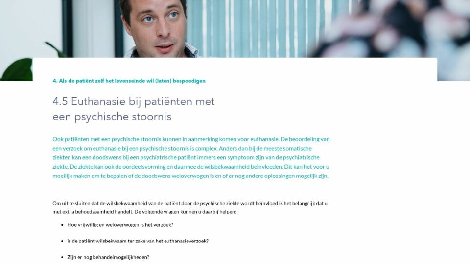 Ook patiënten met een psychische stoornis kunnen in aanmerking komen voor euthanasie. De beoordeling van een verzoek om euthanasie bij een psychische stoornis is complex. Anders dan bij de meeste somatische ziekten kan een doodswens bij een psychiatrische patiënt immers een symptoom zijn van de psychiatrische ziekte. De ziekte kan ook de oordeelsvorming en daarmee de wilsbekwaamheid beïnvloeden. Dit kan het voor u moeilijk maken om te bepalen of de doodswens weloverwogen is en of er nog andere oplossingen mogelijk zijn.