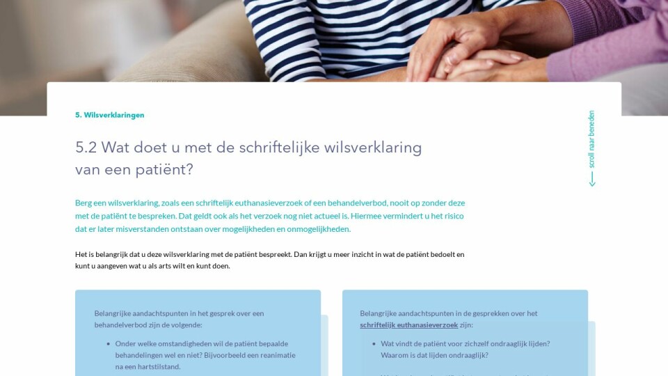 Berg een wilsverklaring, zoals een schriftelijk euthanasieverzoek of een behandelverbod, nooit op zonder deze met de patiënt te bespreken. Dat geldt ook als het verzoek nog niet actueel is. Hiermee vermindert u het risico dat er later misverstanden ontstaan over mogelijkheden en onmogelijkheden.